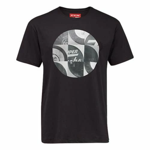 LOGO: Black and white photo print of an assortment of vintage and used pucks
